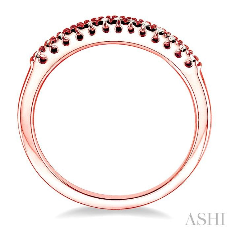 Allure your loved ones with this articulate diamond band fashioned in luminous 14 karat rose gold. This beautiful design showcases 13 sparkling round cut diamonds calmly rests in pave set and elegantly accumulates on the band. The total diamond weight is 1/10 Ctw.