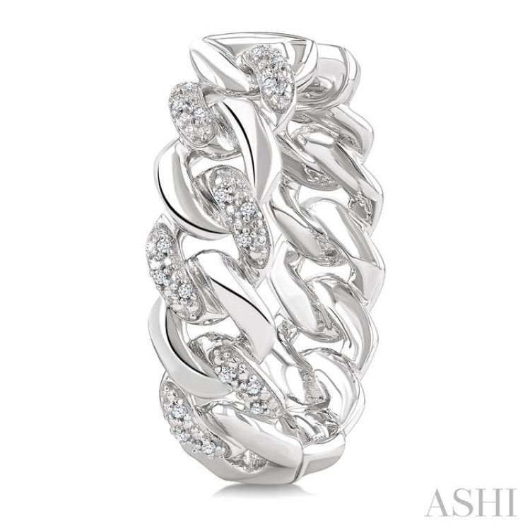 Whether framing the face in daylight or catching spotlight beams after dusk, these diamond Cuban link hoop earrings redefine classic Cuban links with just the right measure of brilliance. From front to back, a sleek sequence of alternating Cuban links defines the hoops, with plain silver links giving way to diamond-adorned links on each hoop front, offering a sophisticated interplay of texture and sparkle. A total of 36 pave set single cut diamonds embellish the hoop front, 18 on each hoop. Engineered for comfort, a lever-back closure secures the diamond Cuban link hoop earrings. The rhodium-plated silver setting accentuates the crisp fire of the diamonds. Total diamond weight is 1/10 ctw.