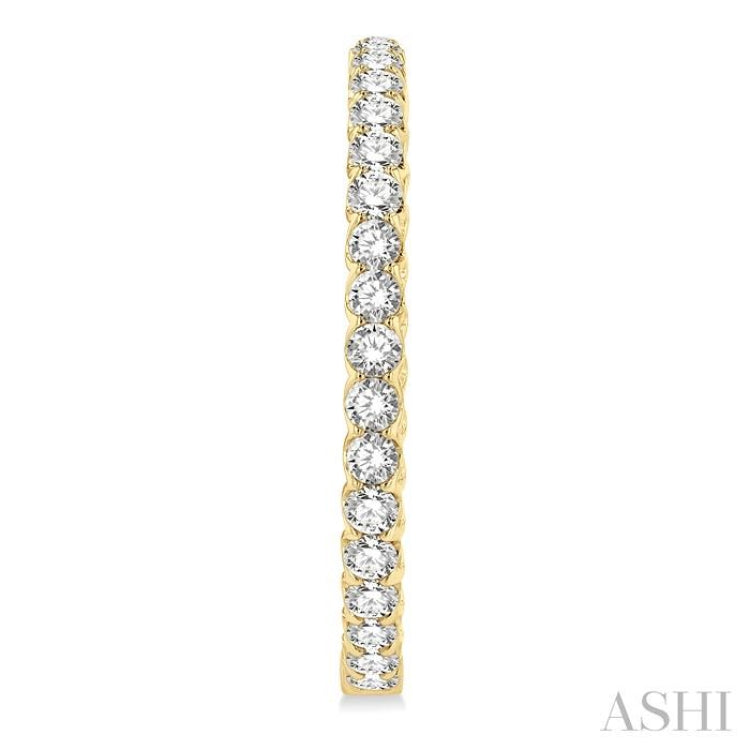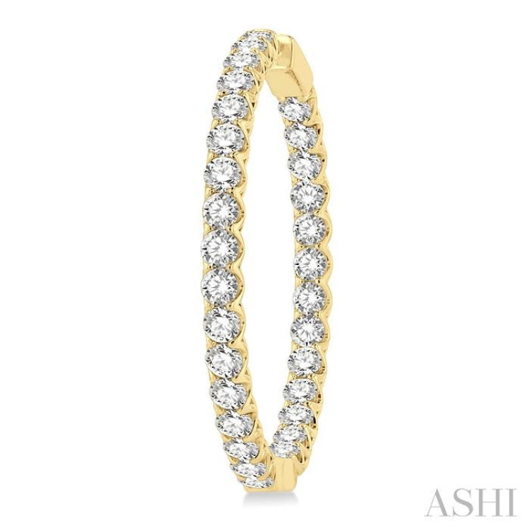 With jewelry, you can always create your own looks that define your personality. Making a pick from a range of designs, allows you to get creative and generate unique results. A fashionable selection would be this diamond hoop earring, which offers aesthetic appeal and beauty. Its distinctive feature is the round cut diamond embellishment on the outside, as well as on the inner back. This gives it a grand in and out diamond look. There is a total of 60 prong set round cut diamonds adorning the hoops, 30 diamonds on each hoop. The earring is molded in a polished rhodium finish 14 karat yellow gold. Total diamond weight is 10 Ctw.