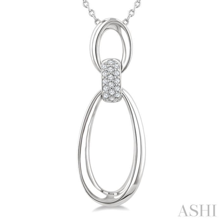 Drift between contemporary minimalism and subtle sparkle with this diamond pendant, which worn as a singular statement or layered with longer chains for a curated effect, transforms simplicity into a modern signature. It features two open-window oval-shaped links, a small one at the top and a larger one below it. These are linked by a slender connector embellished with 16 pave set single cut diamonds, providing a refined focal point against the smooth silver frames. The interplay of negative space and pinpoint diamond accents creates a quietly striking silhouette that complements both casual and dressy ensembles. A 1.00MM SSL cable chain carries the diamond pendant, both of which are fashioned in rhodium finish silver. Total diamond weight is 1/10 ctw.